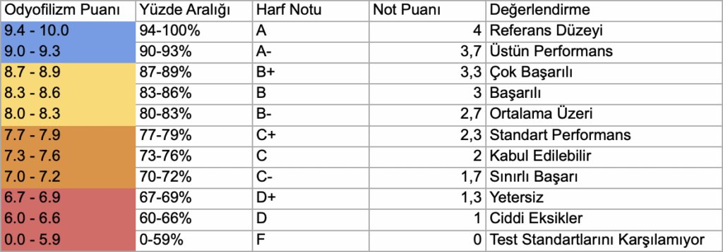 Puanlama sistemimizin nasıl işlediğini öğrenmek için tabloya göz atabilirsiniz. Tablo; yüzde aralığı, harf notu, not puanı ve değerlendirme sütunlarıyla her seviyenin ne anlama geldiğini açıkça göstermekte.